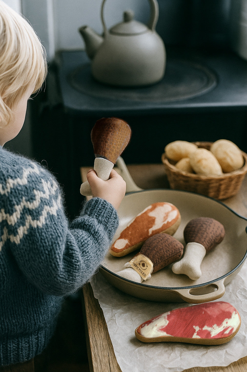 Our handmade fabric version celebrates both traditions — the familiar shape of a well-loved meal and the charming frill — reimagined in soft upcycled cotton for sustainable pretend play.