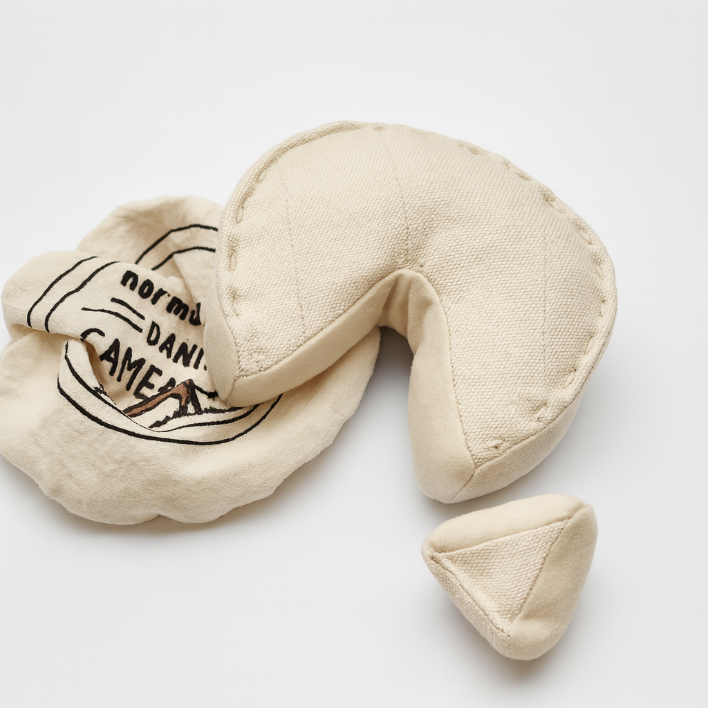 Crafted from cotton canvas, velvet, and printed with plant-based silkscreen ink, it comes complete with its own cotton wrapper for a realistic “fresh-from-the-fridge” feel. The soft, snowy design captures the essence of real Camembert – minus the smell and calories!