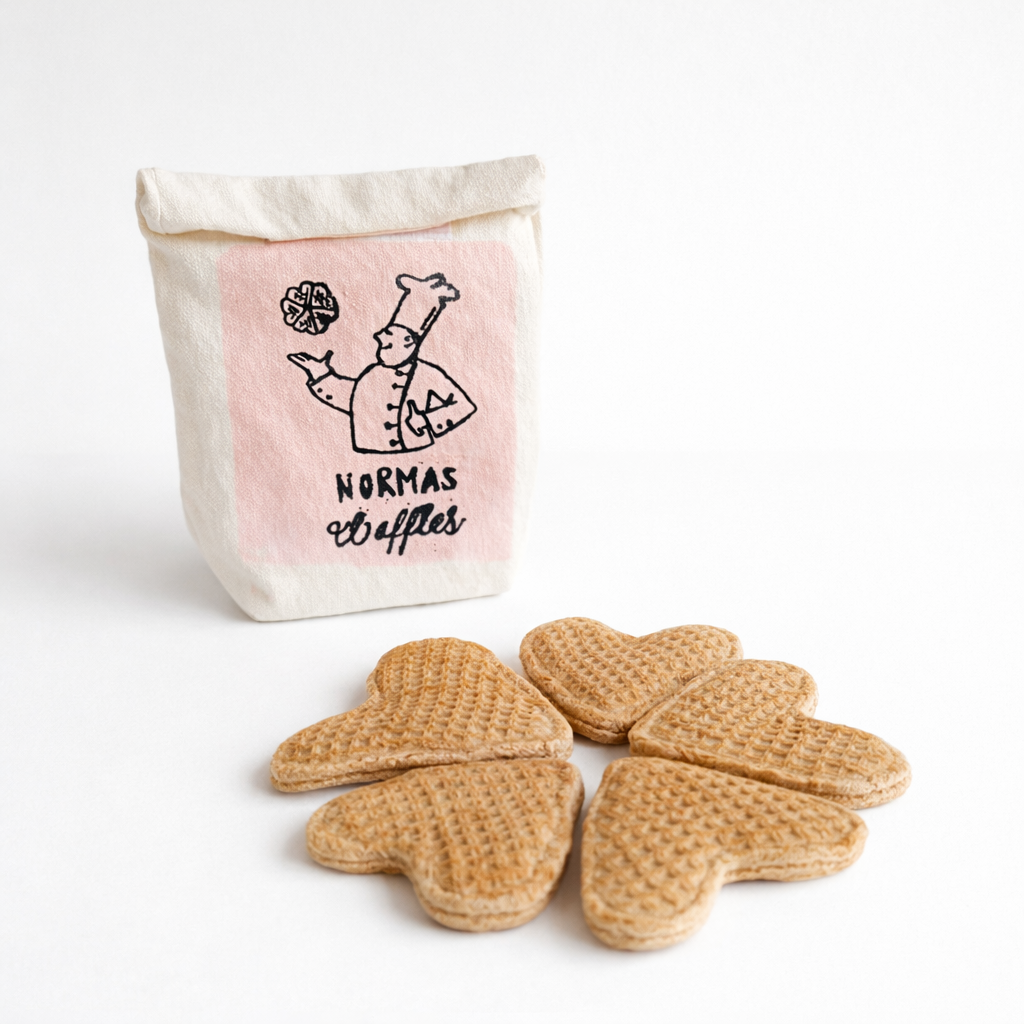 Inspire pretend play with this beautifully handmade 5-piece waffle set, complete with a soft, velcro-closed fabric baker bag. Crafted with care in Denmark, each waffle, whipped cream dollop, and strawberry slice is sewn from 100% waffle cotton, velvet and cotton canvas printed using eco-friendly, plant-based silkscreen ink. Perfect for little hands and big imaginations, this charming set encourages roleplay, storytelling, and creative play.
